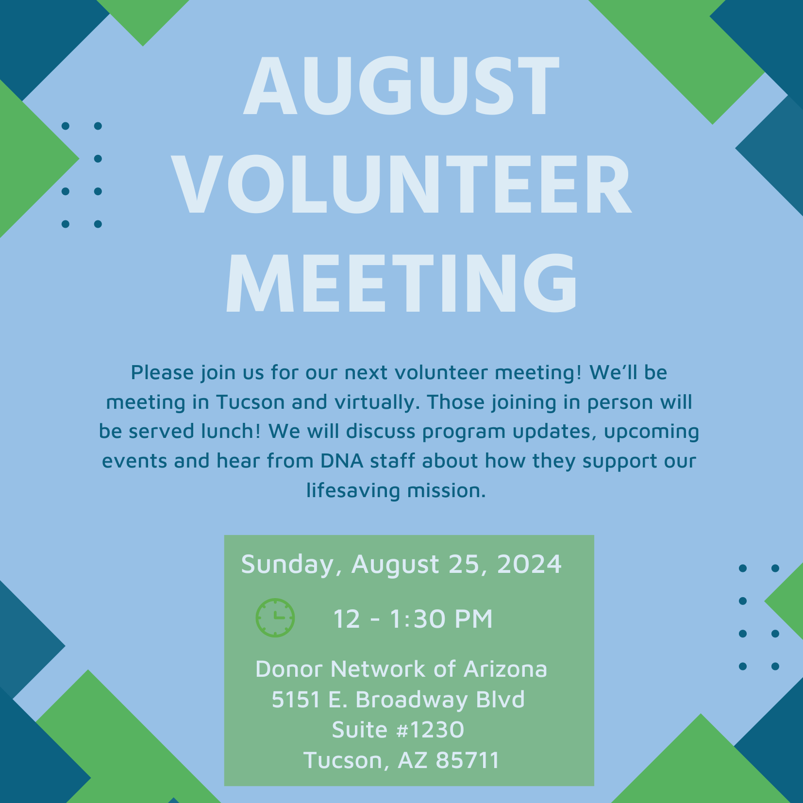 Join us in Tucson for our August Volunteer meeting! Lunch will be provided to those joining in person. We'll talked about program updates, upcoming events, and hear from special guest speakers about how their work contributes to DNA's lifesaving mission.